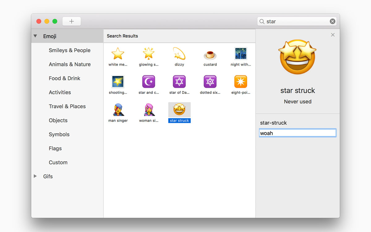 它就像Slack中的表情符号发现者一样,当你想使用表情符号时输入一个冒号,输入它的名字,然后再次敲入回车插入,这比使用Mac内置的表情符号键盘更方便。