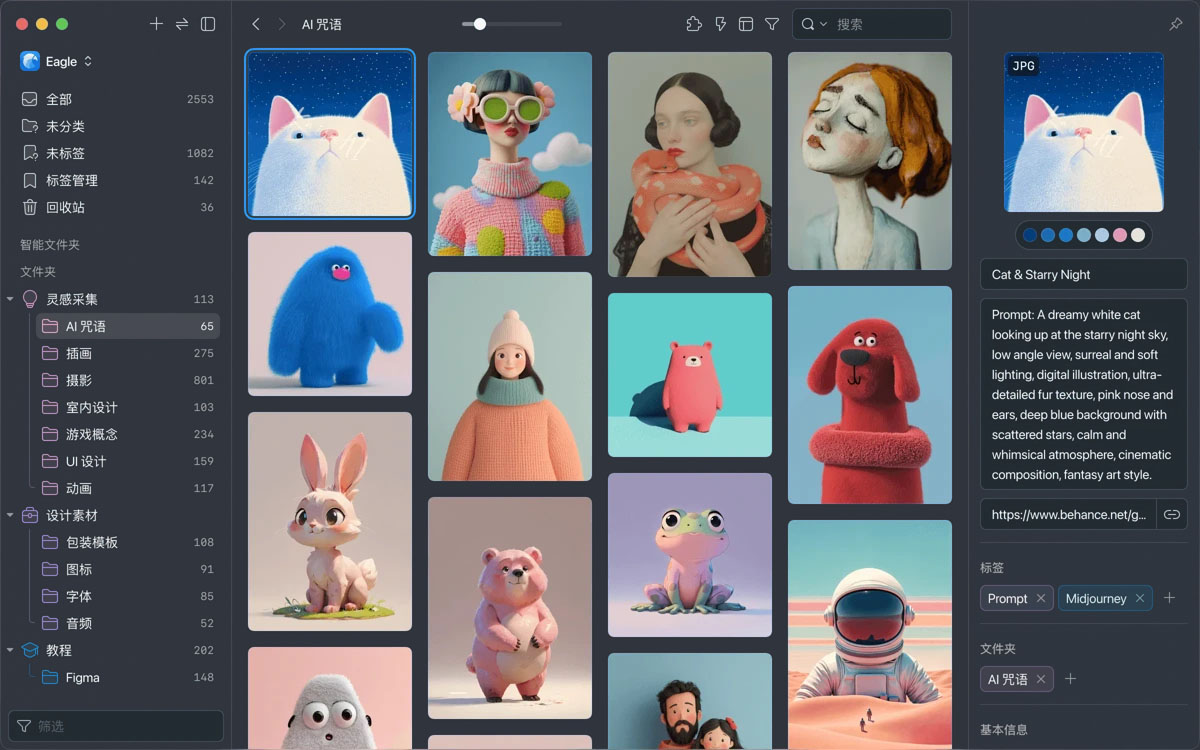 Eagle for Mac 是一款超强的素材管理神器,满足你在素材管理上各种需求。无论是数万张灵感图片、还是拥有上百种分类,都可以用你从未有过的流畅感,快速完成任务。使用 Eagle 轻松收集及整理“案例、灵感、截图、图片、视频、音频、情绪板”等各种素材,激发更多创意灵感,让工作变得更有效率!全新 Eagle 4.0 已经发布,此次更新带来了一系列令人兴奋的功能和增强,可以说是一次全面的革新,将帮助您的日常工作流程更加灵活和高效。感兴趣的朋友可以下载体验一下。