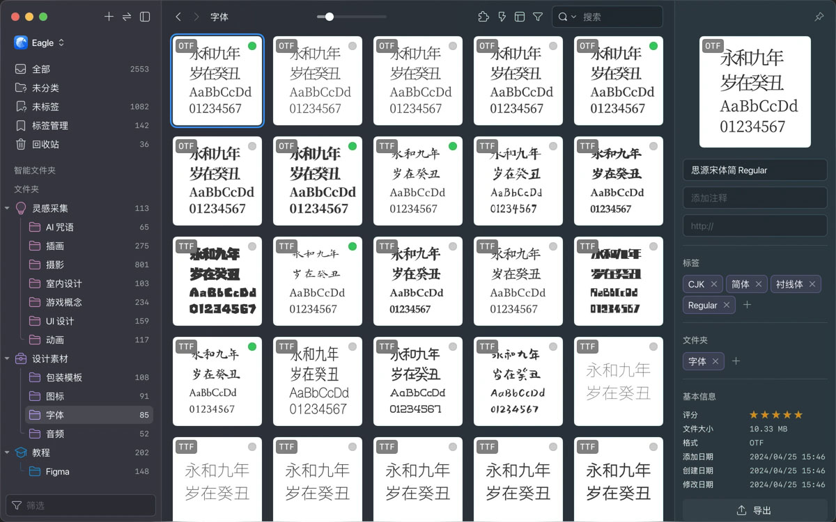面对日积月累的凌乱素材,单一分类的效率越来越低。Eagle 提供多种分类方式,轻松让海量素材始终保持井然有序。