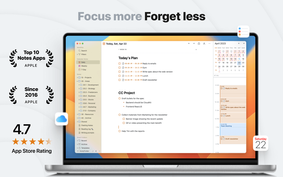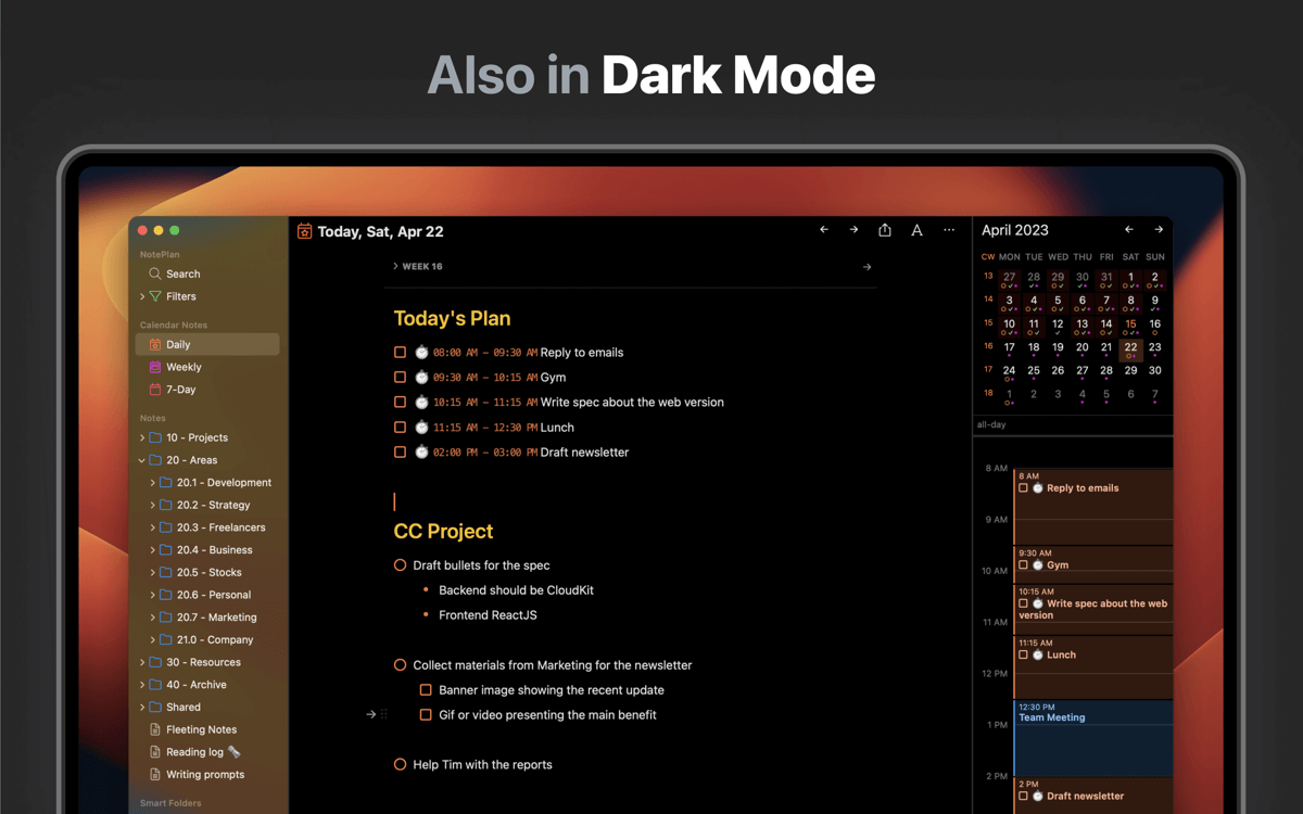 NotePlan 是一款专为Mac用户打造的支持 MarkDown 的日历工具,用简单灵活的日常计划系统提升你的生产力,这款软件是一款设计精美操作简单的日历工具,可以帮助我们使用Markdown编辑器管理日常任务和事件。支持在“日历”应用程序中注册的任何外部日历,来自其他日历的事件会自动同步。NotePlan 允许您在一个地方管理所有内容:任务、笔记和日历。非常适合项目经理、设计师、研究人员、作家、学生或任何想要有条理和效率的人。