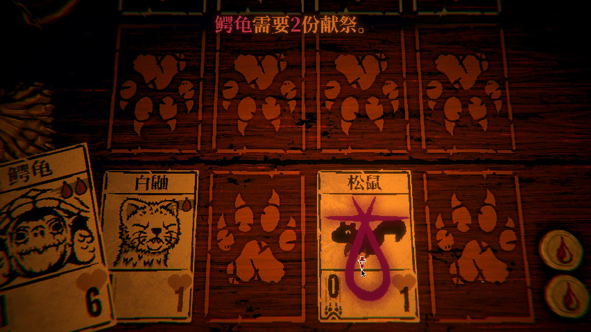 不仅如此,在Inscryption游戏中绝大多数卡牌都是不能直接打出来的,你可以看到这些牌面右上方有一个血滴数量的标志,那个是出卡时需要牺牲的活物数值。比如你想打“狼”这张牌,它需要2个血滴,那么你就至少要在牌桌上牺牲掉己方的两个活物才行,因此玩家每一次出卡都需要权衡利益,然后做出合理的选择,玩起来十分富有策略性和考验心理。