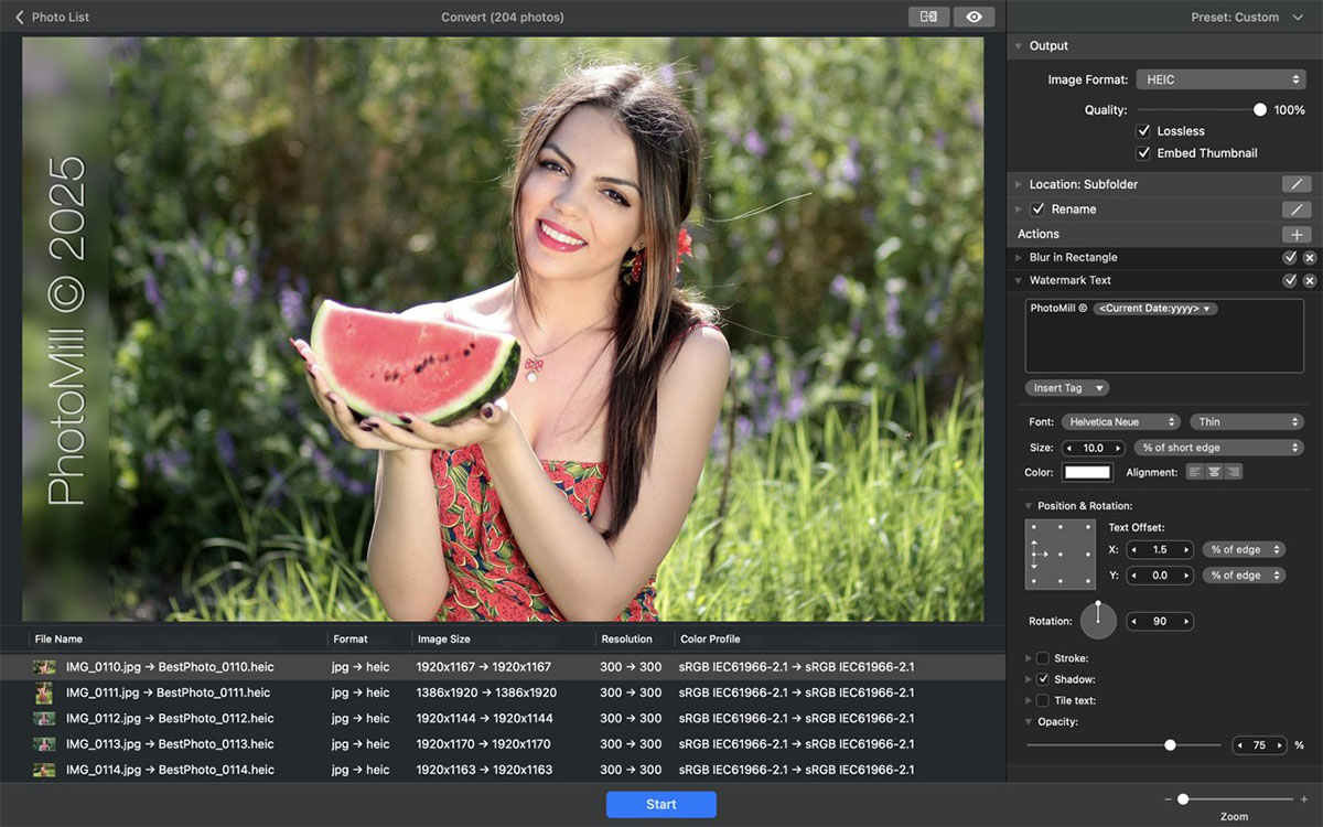 您可以使用照片元数据信息-标签:拍摄日期、关键字、相机制造商等,以及输入的文本。字体大小可以是固定的,也可以是相对于图像宽度、高度、长边或短边的。多行文字、笔划、阴影、旋转、平铺等功能。