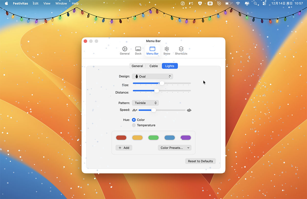 Festivitas for Mac 是一款专为 Mac 设备开发的动态灯光雪花装饰工具,为您的 Dock 栏和菜单栏添加节日彩灯,并将您的桌面变成一个飘雪的冬季仙境。此应用提供多种可自定义的灯光元素,包括不同的光管形状(如圆形、心形、星星等)、颜色预设(如 Frosty White、Candy Cane Red)以及动画效果(如闪烁、波浪、追逐)。用户还可以调整灯光数量、间距和动画速度,以匹配个人喜好。Festivitas 一启动就能点亮您的菜单栏和Dock栏,让您瞬间沉浸在节日氛围中。