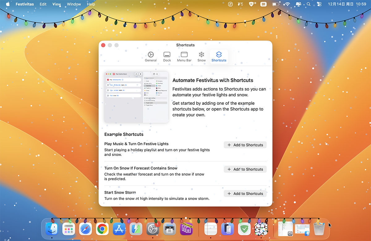 首次启动时,Festivitas 将请求访问辅助功能。Festivitas 需要此权限才能定位屏幕上的 Dock 栏并用节日灯光装饰它。您可以随时在“系统设置”→“隐私与安全”→“辅助功能”中启用或禁用此权限。