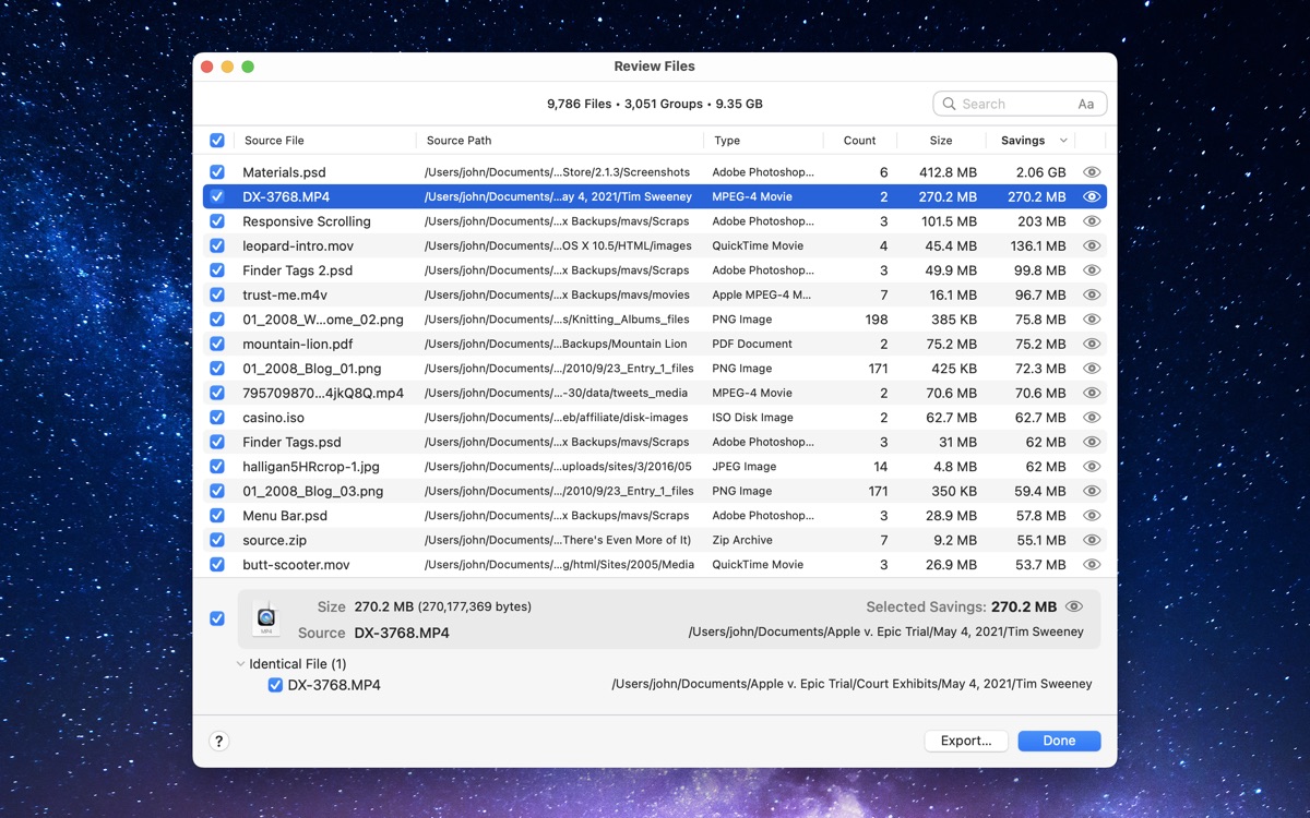 当Hyperspace找到内容相同的文件时,它会将它们放在一个组中。目标是通过将组中除一个文件外的所有文件转换为单个指定源文件的节省空间的克隆来回收磁盘空间。