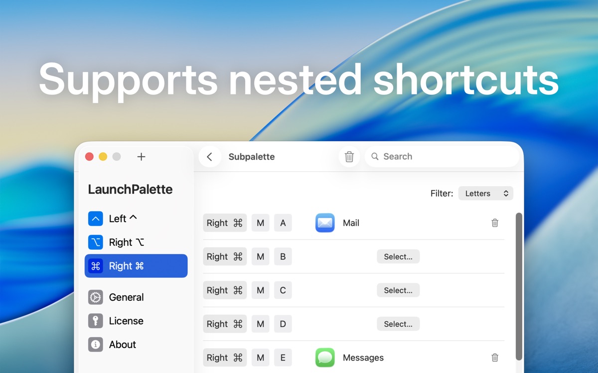 • 真正记得住的快捷键 — 创建直观的组合,如右 ⌘ M → A 打开邮件,右 ⌘ M → E 打开信息。