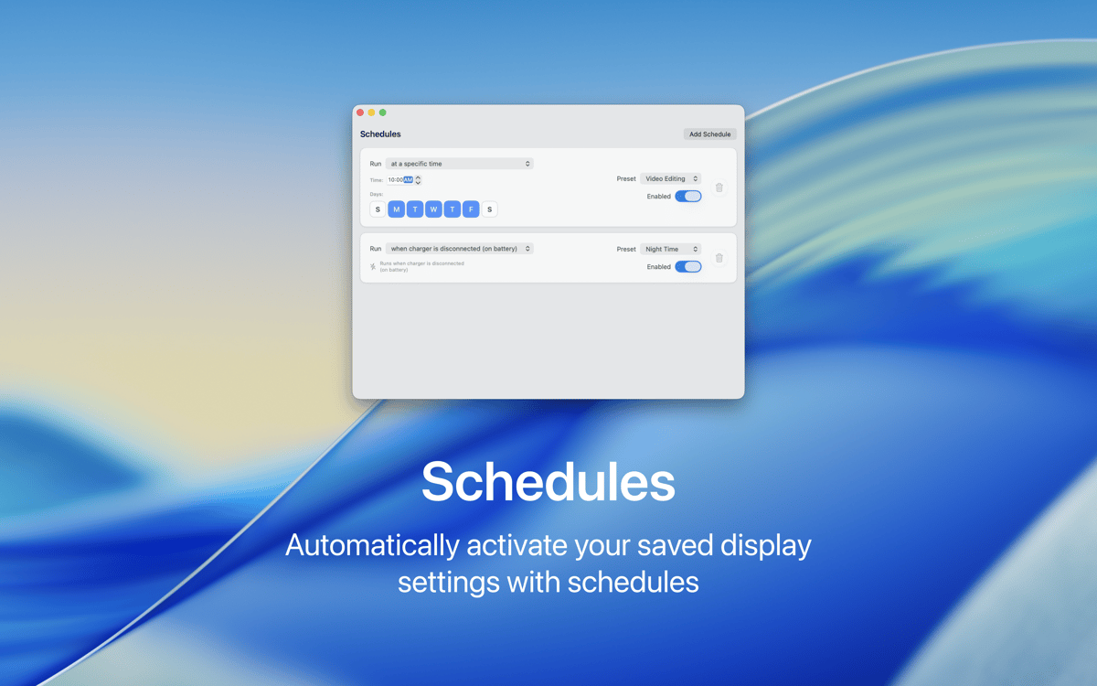 与BetterDisplay相比,DisplayBuddy 拥有漂亮的原生macOS界面,用数千台监视器测试了坚如磐石的DDC/CI实施,支持保存多个显示器上的所有显示设置,并且根据一天中的时间、电池电量或其他条件自动更改设置。
