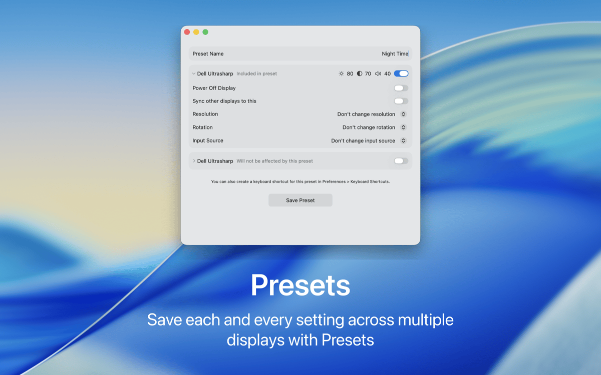 即使只是几个设置,手动切换亮度、对比度或音量也可能令人望而生畏,特别是如果你经常在少数设置中使用相同的几种模式,例如晚上、办公室、在家工作、会议、消费媒体或玩视频游戏。在DisplayBuddy中为不同的工作、照明和观看情况创建自己的预设,并根据需要在它们之间快速切换。